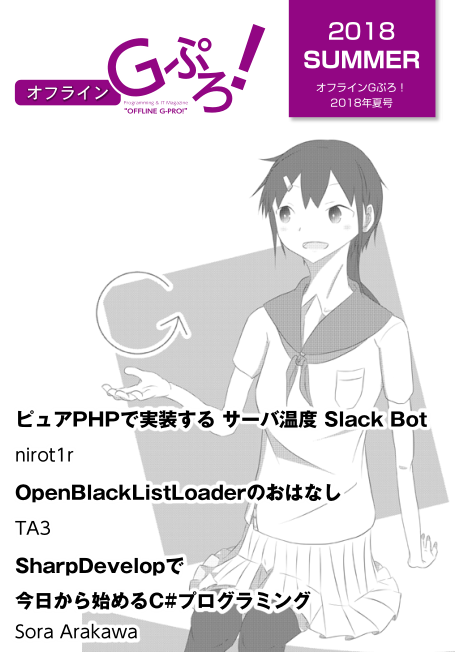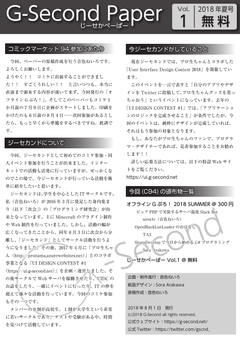 G-Secondメンバーによる技術記事を3本収録したコピー本です。 私の執筆した「SharpDevelopで今日から始めるC#プログラミング」が収録されています。 また、イラスト除く表紙と本文のデザインを担当しました。