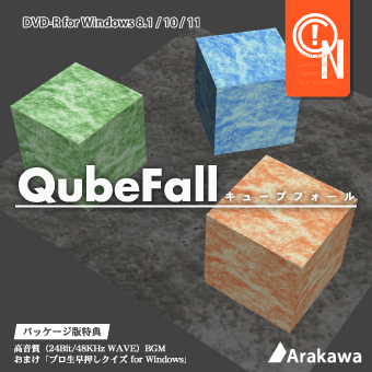 「QubeFall」のパッケージ版です。DVD-Rの大容量を活かし、全てのBGMを高音質の非圧縮音源 (24Bit/48KHz WAVE) で収録しています。 ネット環境が無い場所でも遊べる「プロ生早押しクイズ for Windows」のおまけ付き。